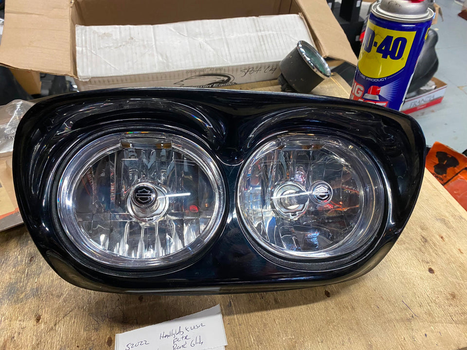 HEADLIGHT ASSY HARLEY ROAD GLIDE W VISOR TRIM H4 HALOGEN FLTR 1998-2012 OEM STOC