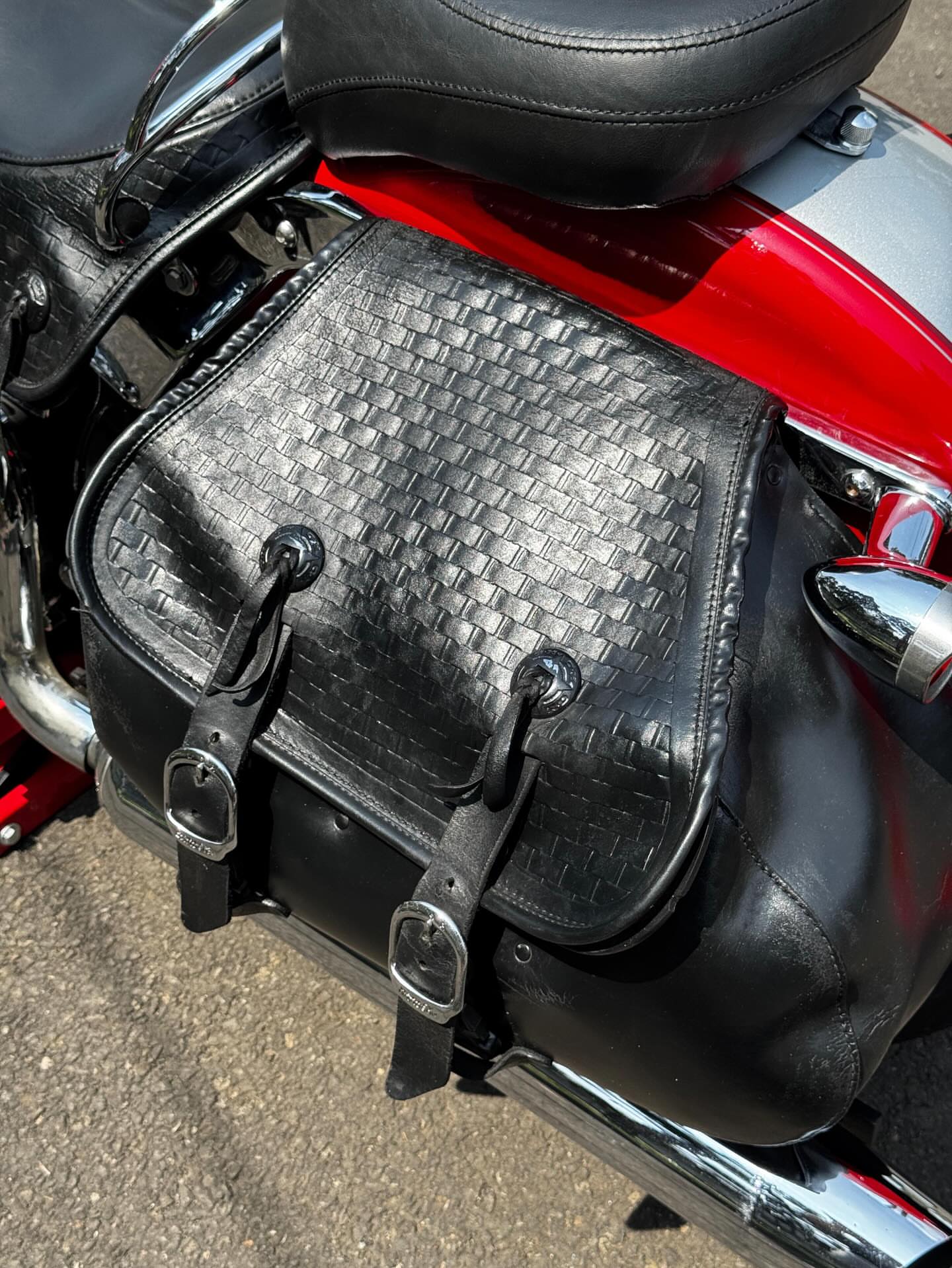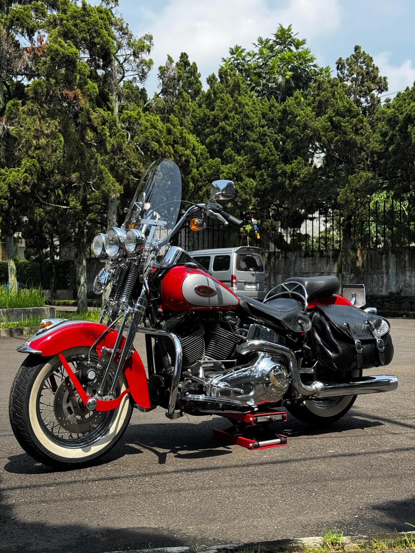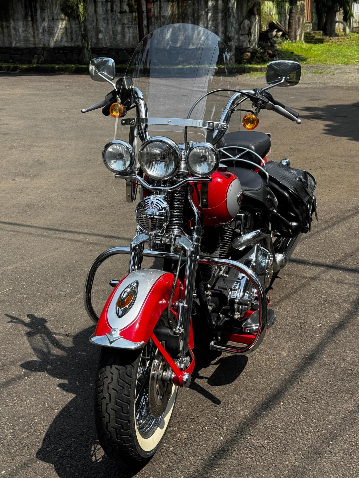 Key Features:The model features classic styling cues such as full fenders, whitewall tires, leather saddlebags, and a tombstone taillight.