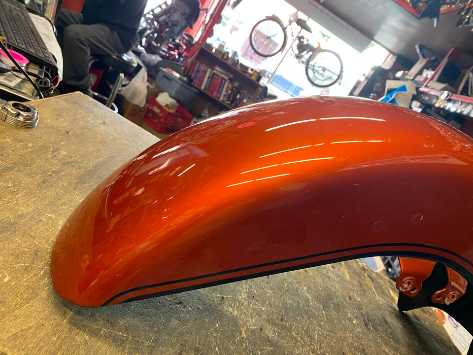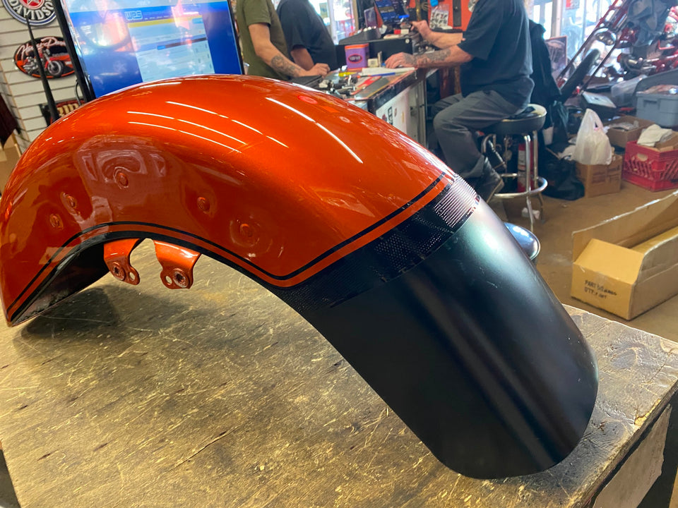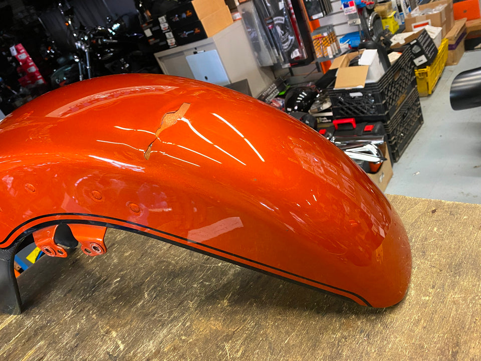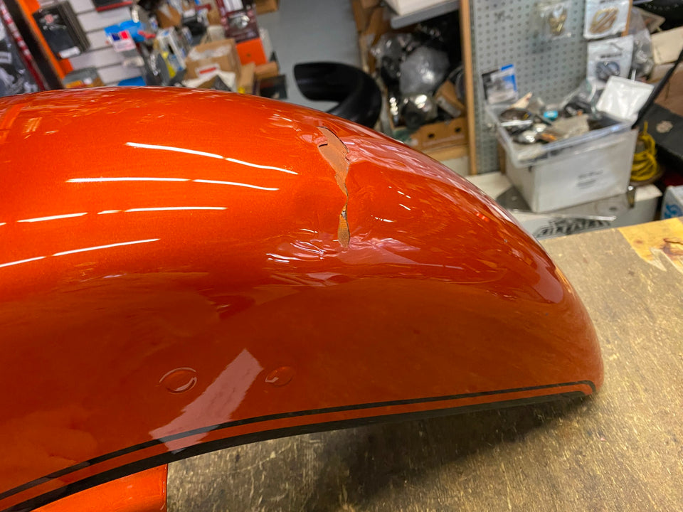2019 Harley CVO Street Glide Scorched Orange Front Fender FLHXS Dent Road FLHRS maybe a good body guy can fix bad area or paint whole fender, not bad..