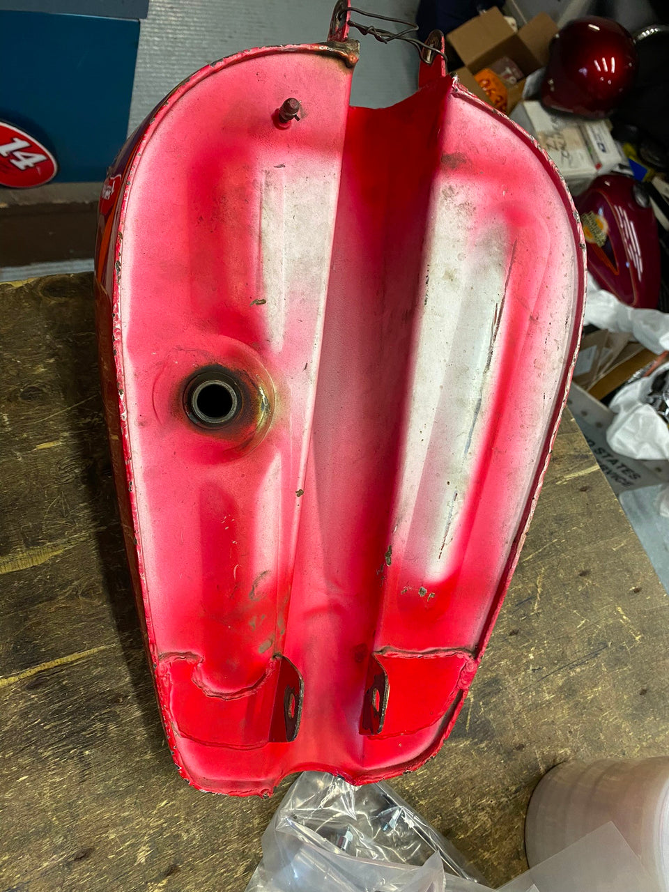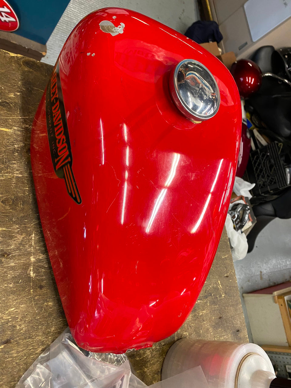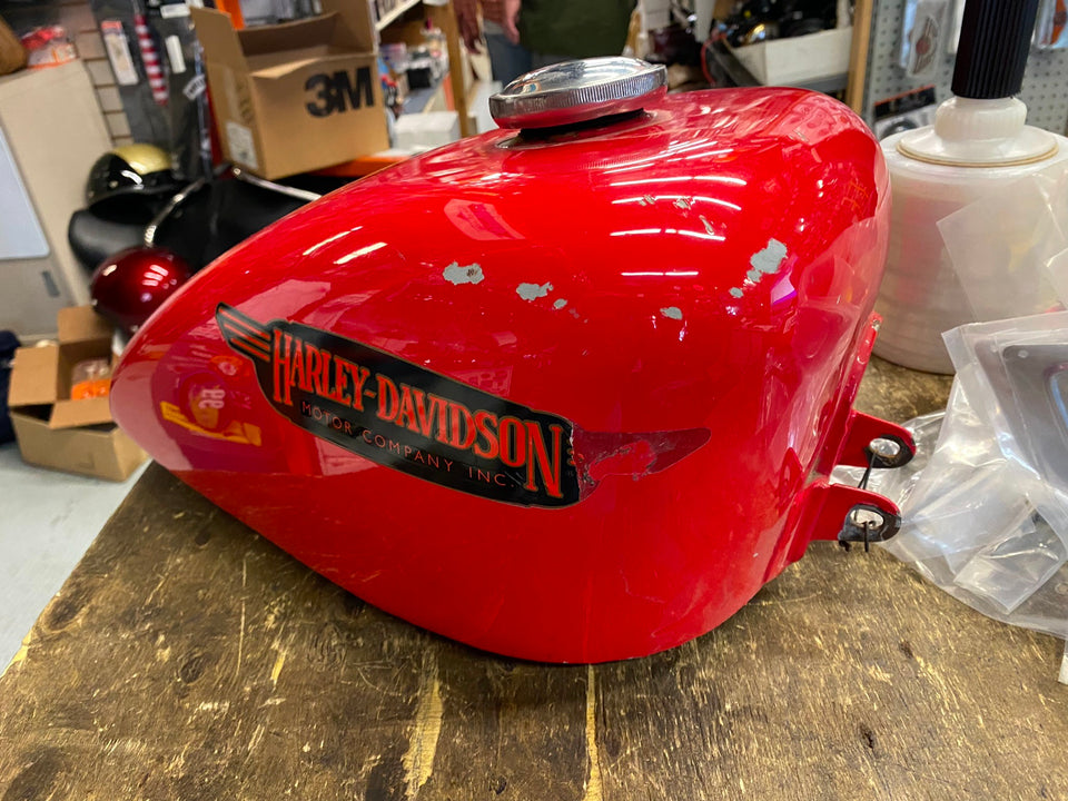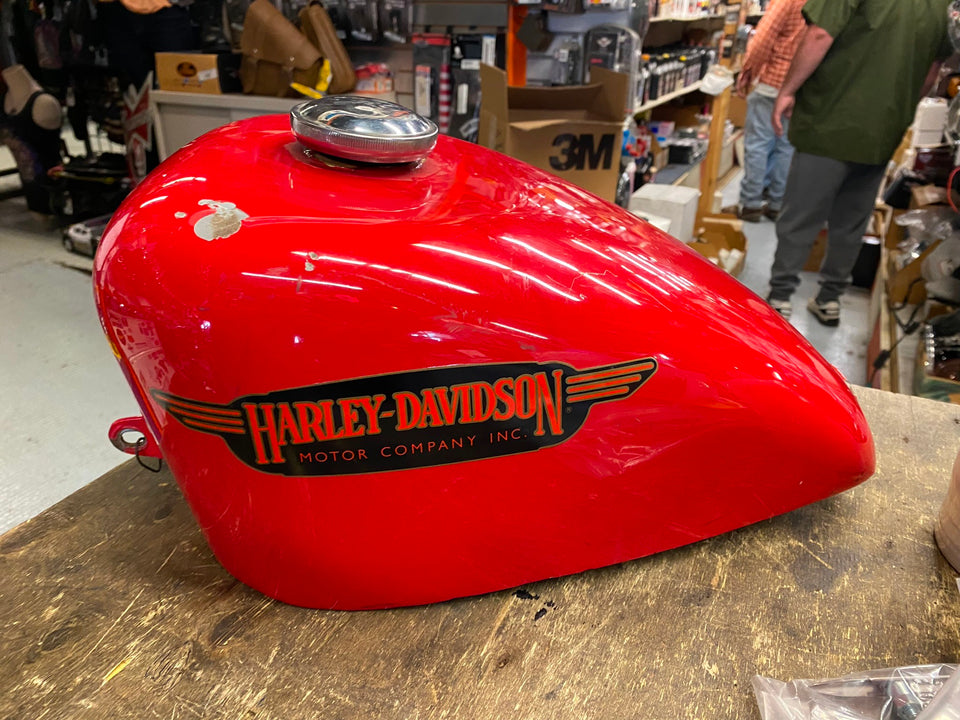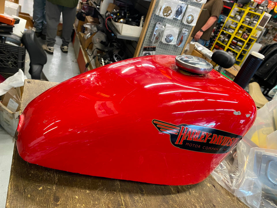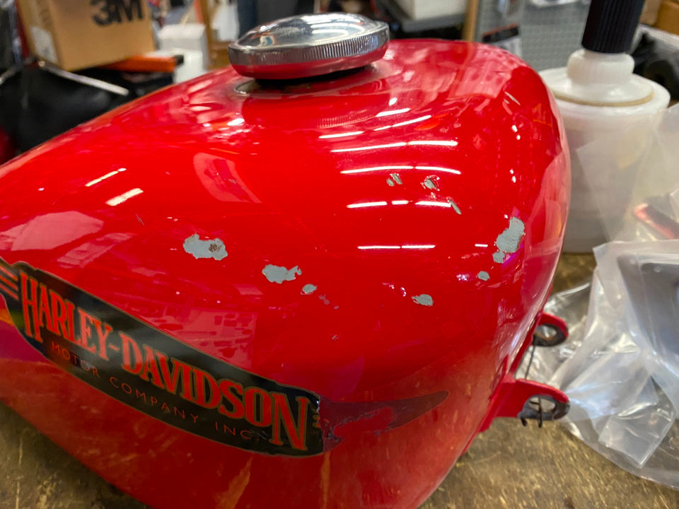 3.1 Gallon Sportster Peanut Gas tank Harley 1982-2003 Chopper Ironhead Shovelhead nice touch of patina... old fxrt tank decals... not dented.. looks like cables hit edges..