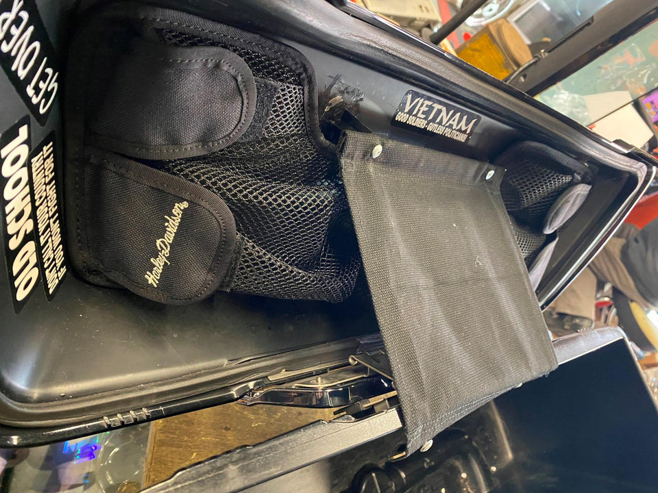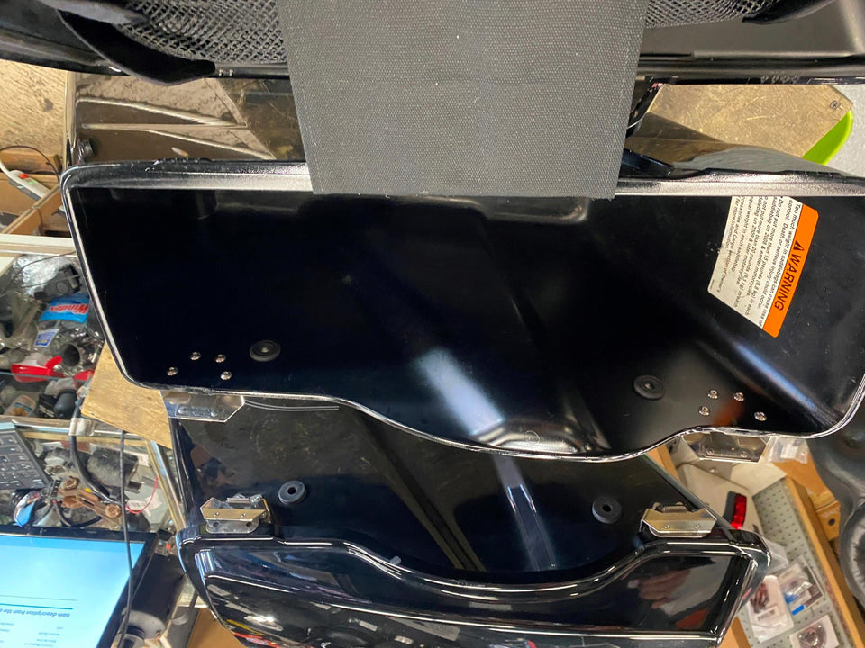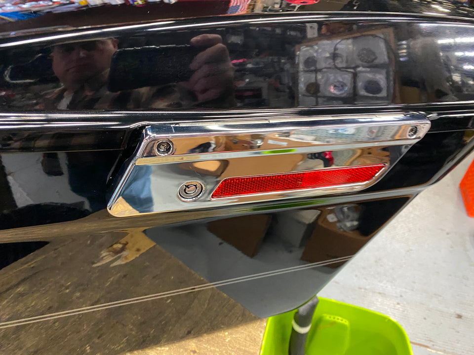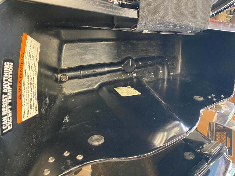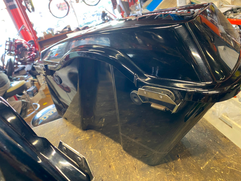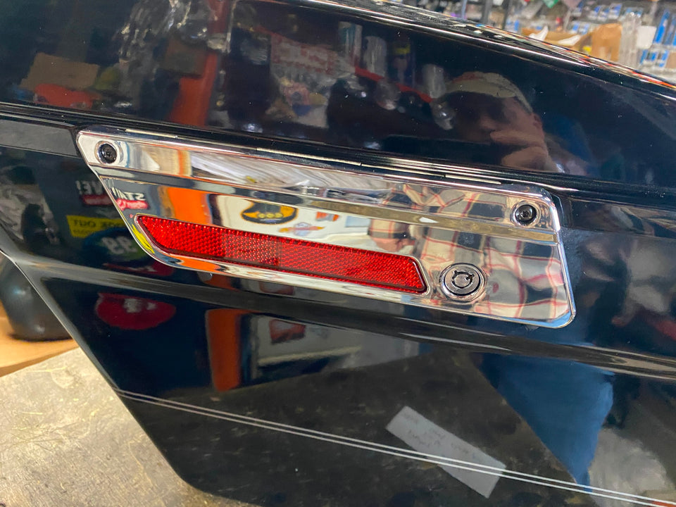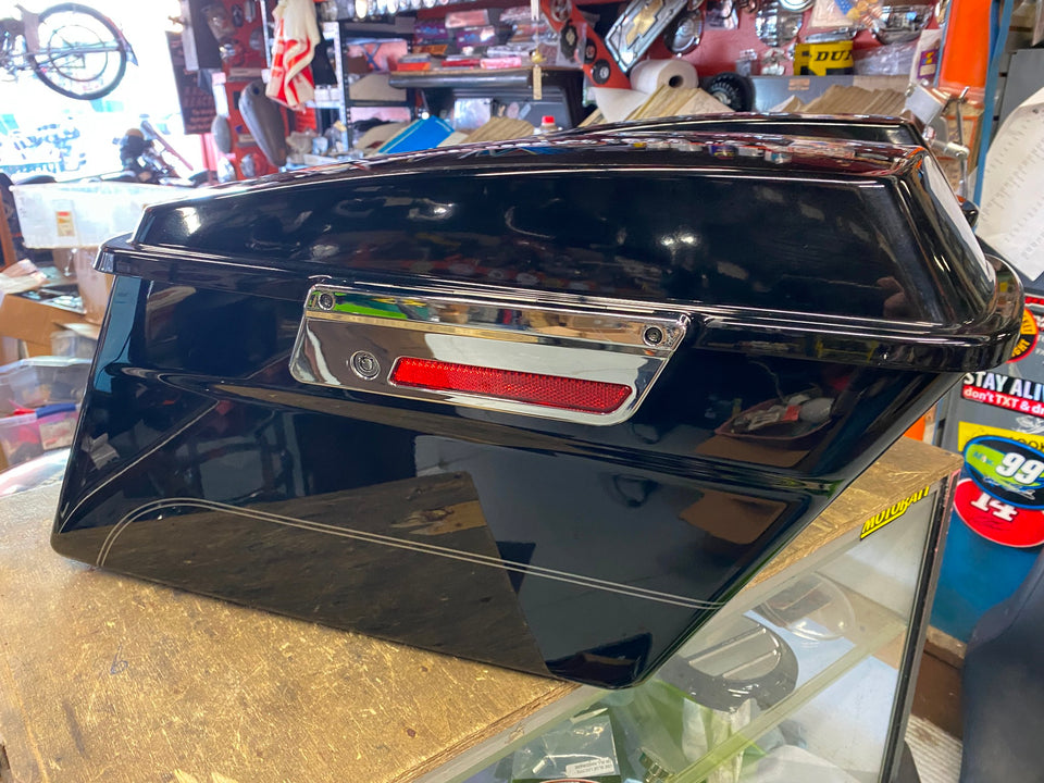 Glide 93-13 FLH. Pretty nice shape, some light scratches on lid (most should buff out). Aftermarket chrome latch covers.. Sorry no keys. Harley lid storage accessory inserts.