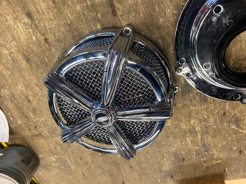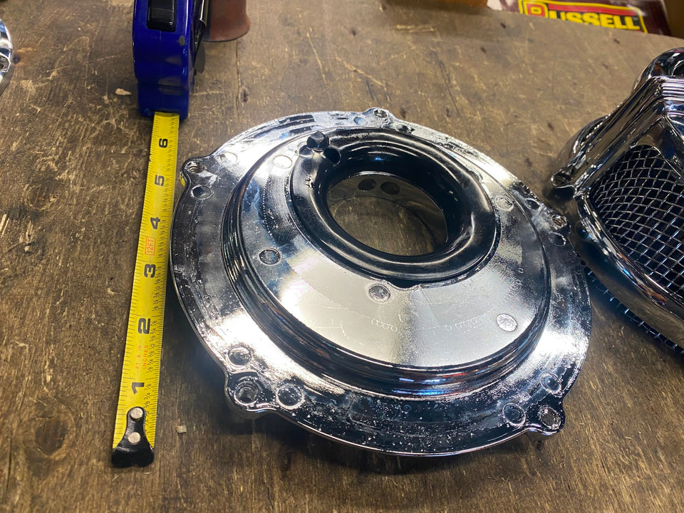 Kuryakyn Air Cleaner Chrome Harley Hi-five Mach 2 Sportster Softail Dyna Touring not sure of all years or fitments... took pics of hole on back, was a display, yes its new....pretty sure its for harley applications....