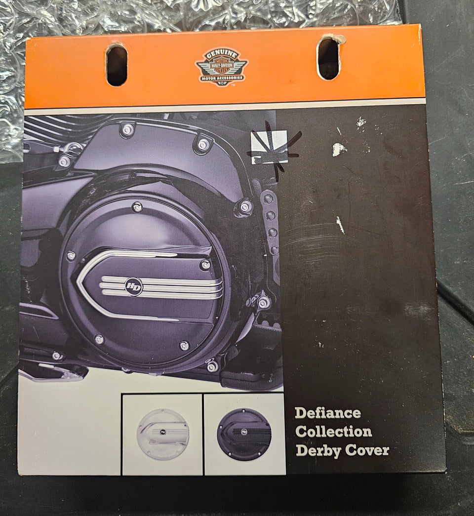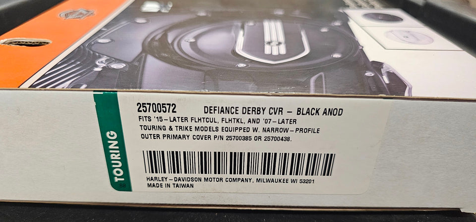 The Harley-Davidson part number 25700572 corresponds to the Defiance Collection Black Anodized Derby Cover.