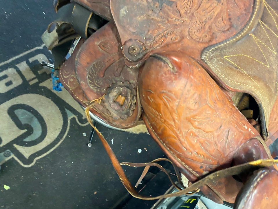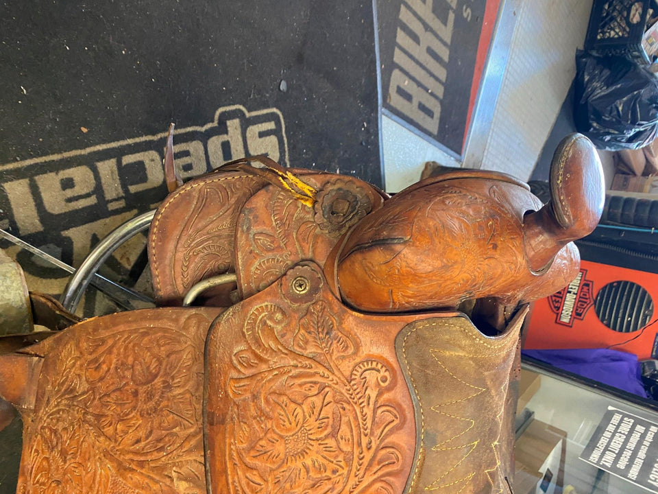 Vtg Hand Tooled Leather Horse Back Saddle Western Cowboy Rancher! some beautiful tooling! needs a good cleanup, some new tassles for conchos