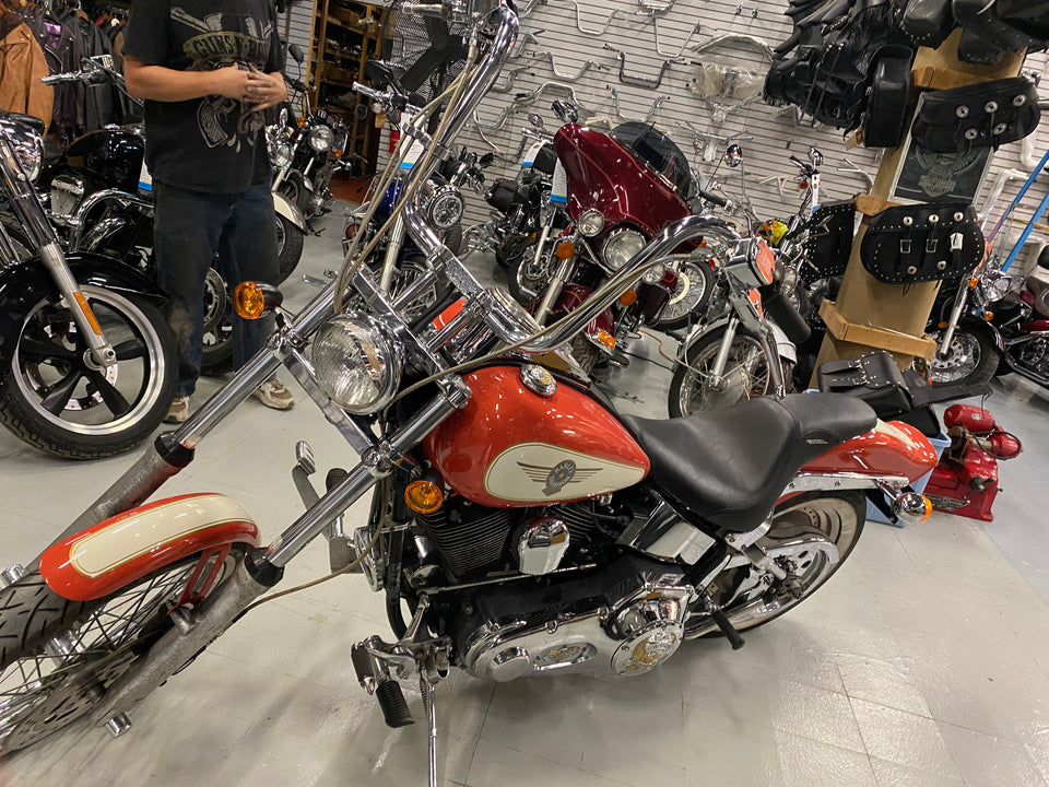 1999 Harley Davidson FXSTC Softail Custom. In a vintage two tone Orange & Cream w/Gold Pinstripe. 29,519 low miles. Come by the shop at Cycle Warehouse, Butler Pa to take a look or call for more details.