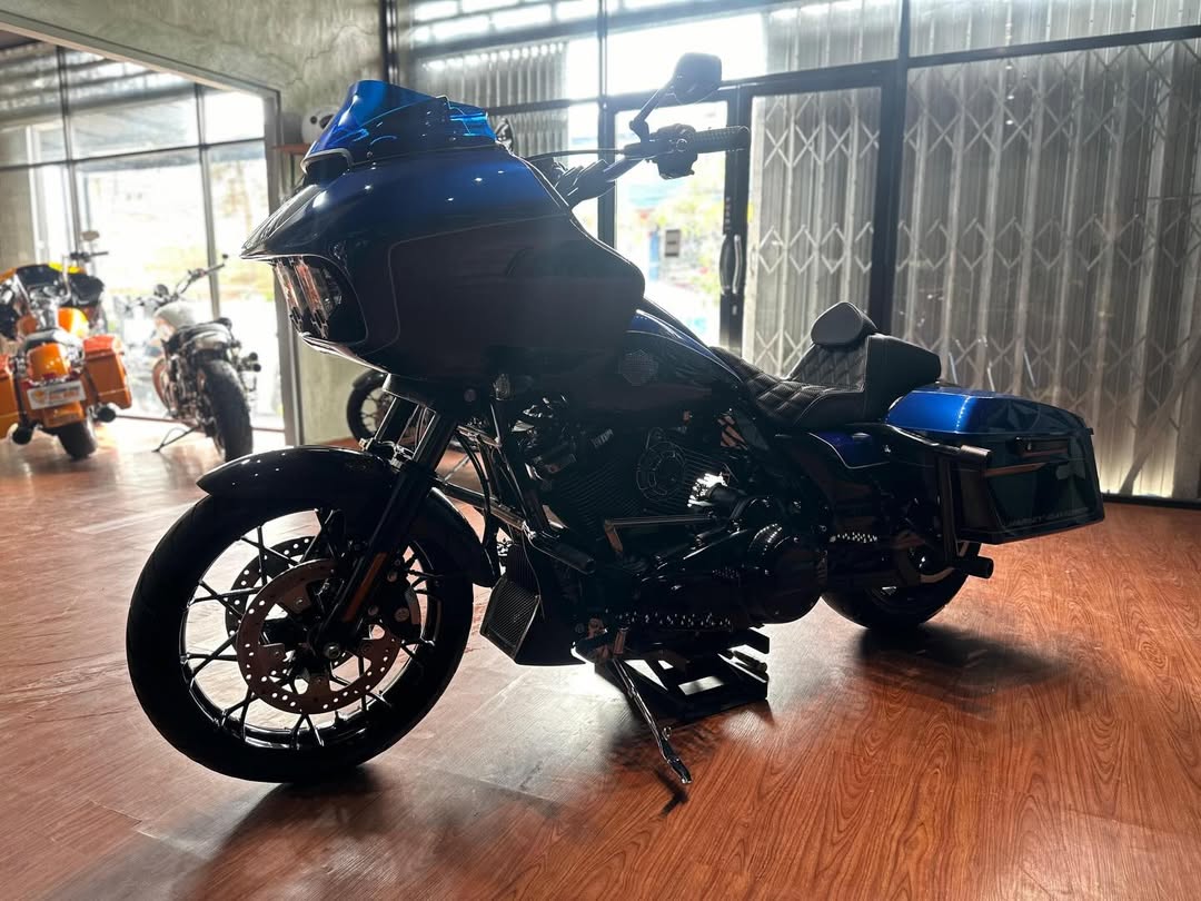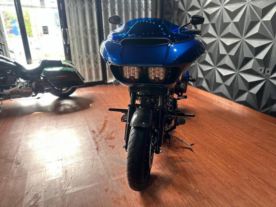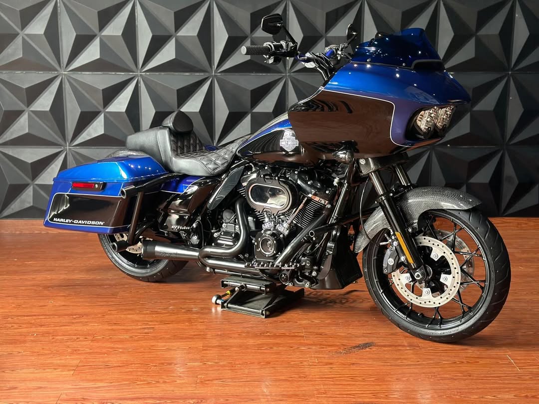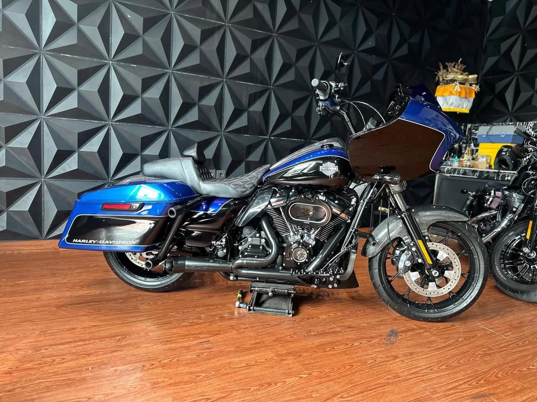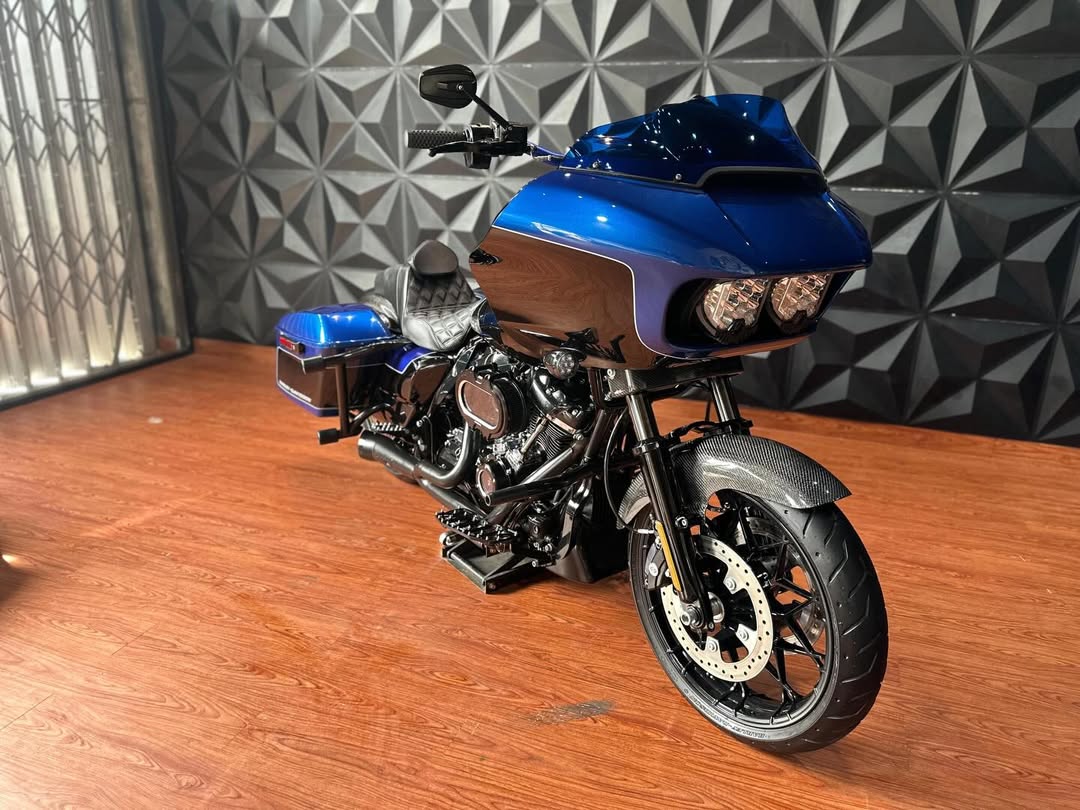 Exhaust TBR: A Two Brothers Racing (TBR) exhaust system is likely for improved sound and performance, along with potential weight reduction.Carbon Fiber Components: Numerous parts, including the front fender, back fender, tank cover, and speedo cover, are made of carbon fiber for a custom look and reduced weight.Windshield Klockwerks Blue Colour: A Klock Werks windshield in blue, which are known for their "flare" design that pushes air up and over the rider, potentially reducing buffeting.Suspension Fox: Upgraded Fox suspension (rear shocks) likely replaces the stock emulsion shocks for improved handling, comfort, and potentially increased lean angle.Jok Saddleman: A Saddlemen seat is installed, a popular aftermarket choice known for enhanced comfort and support, especially for long-distance riding.Headlamp Baja Design: Baja Designs headlamp suggests improved and potentially brighter illumination compared to stock.Various CNC Accessories: Includes a nice air filter (potentially high-flow for performance), derby cover, floorboard, camshaft cover, handlebar, riser, and mirrors, all likely chosen for a custom look and improved durability.Protective Parts: Saddlebag crash bars, engine guard, and heat deflectors offer added protection and heat management.